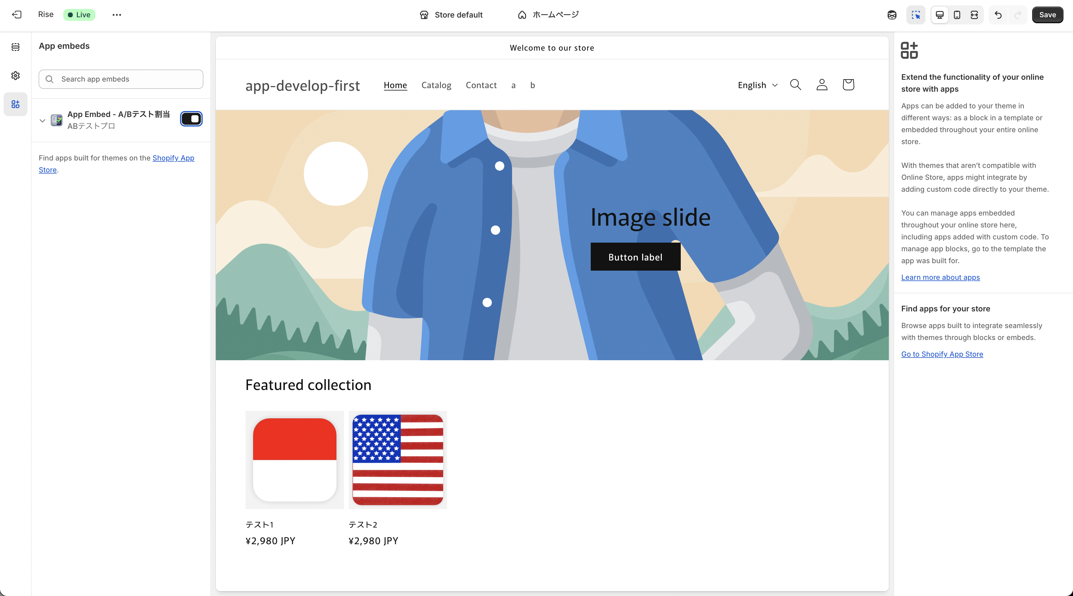 テストの割当と計測は、App Embed(ABテスト埋め込み)が有効なテーマでのみ動作します。