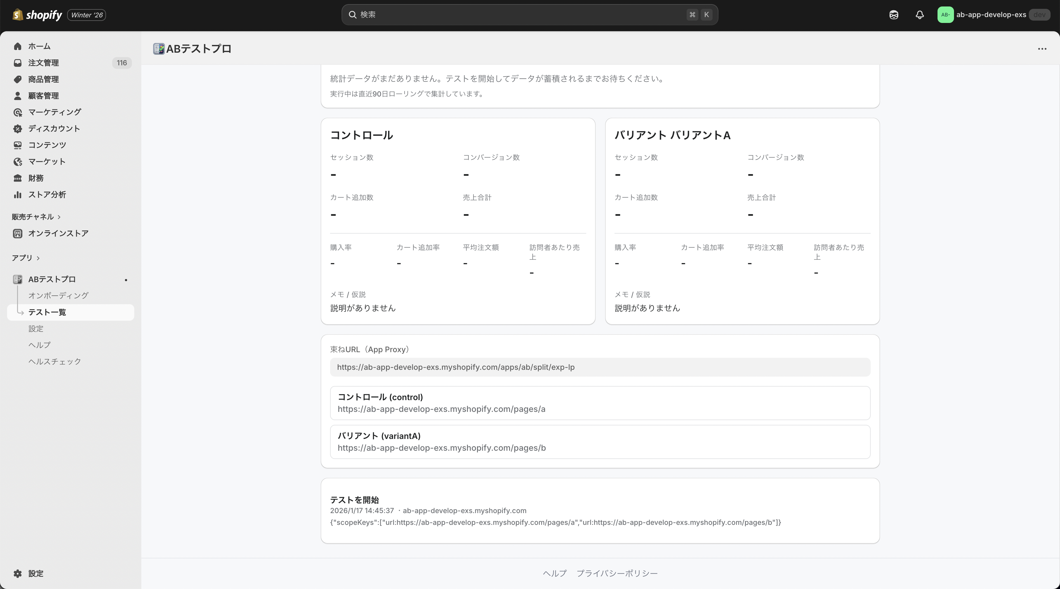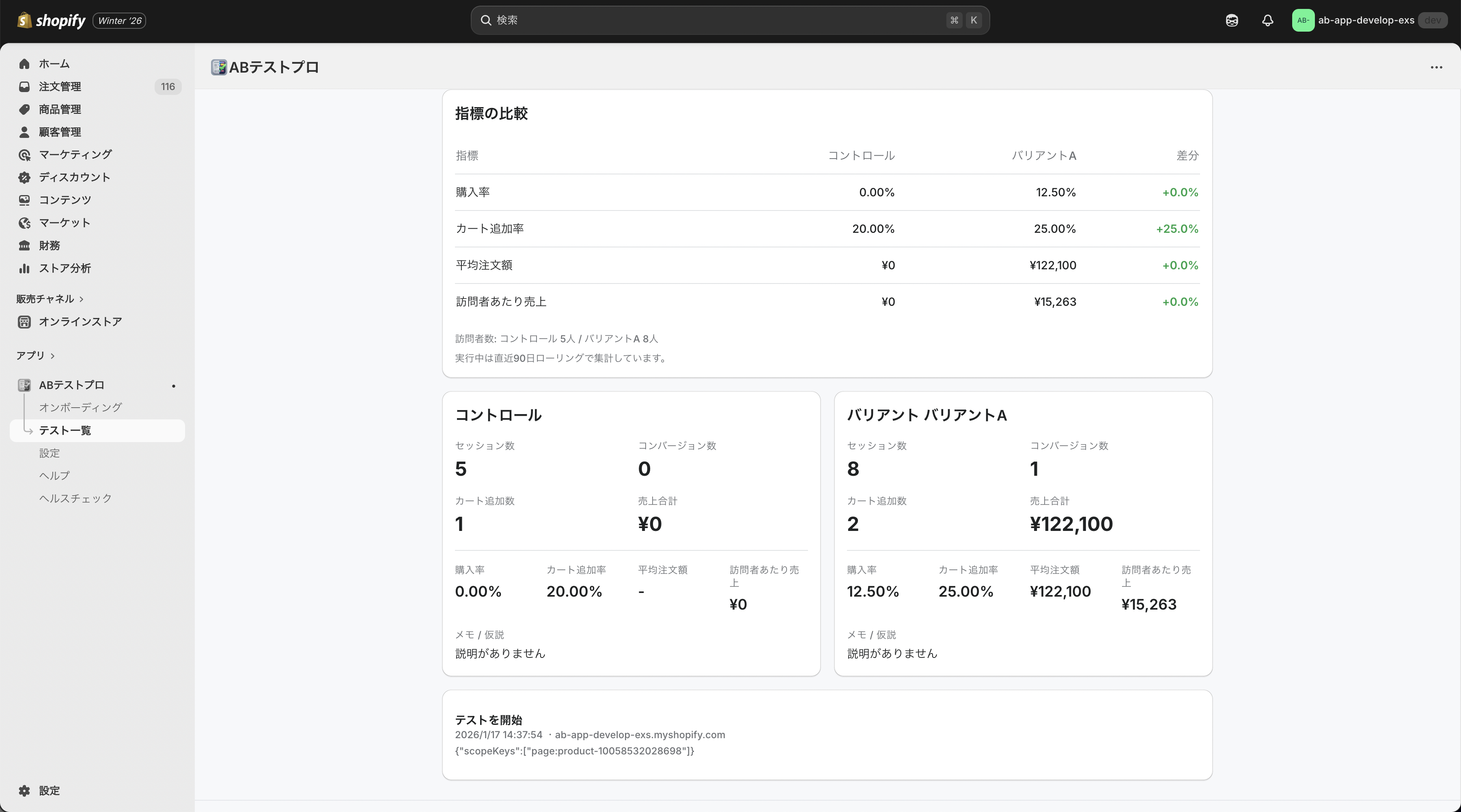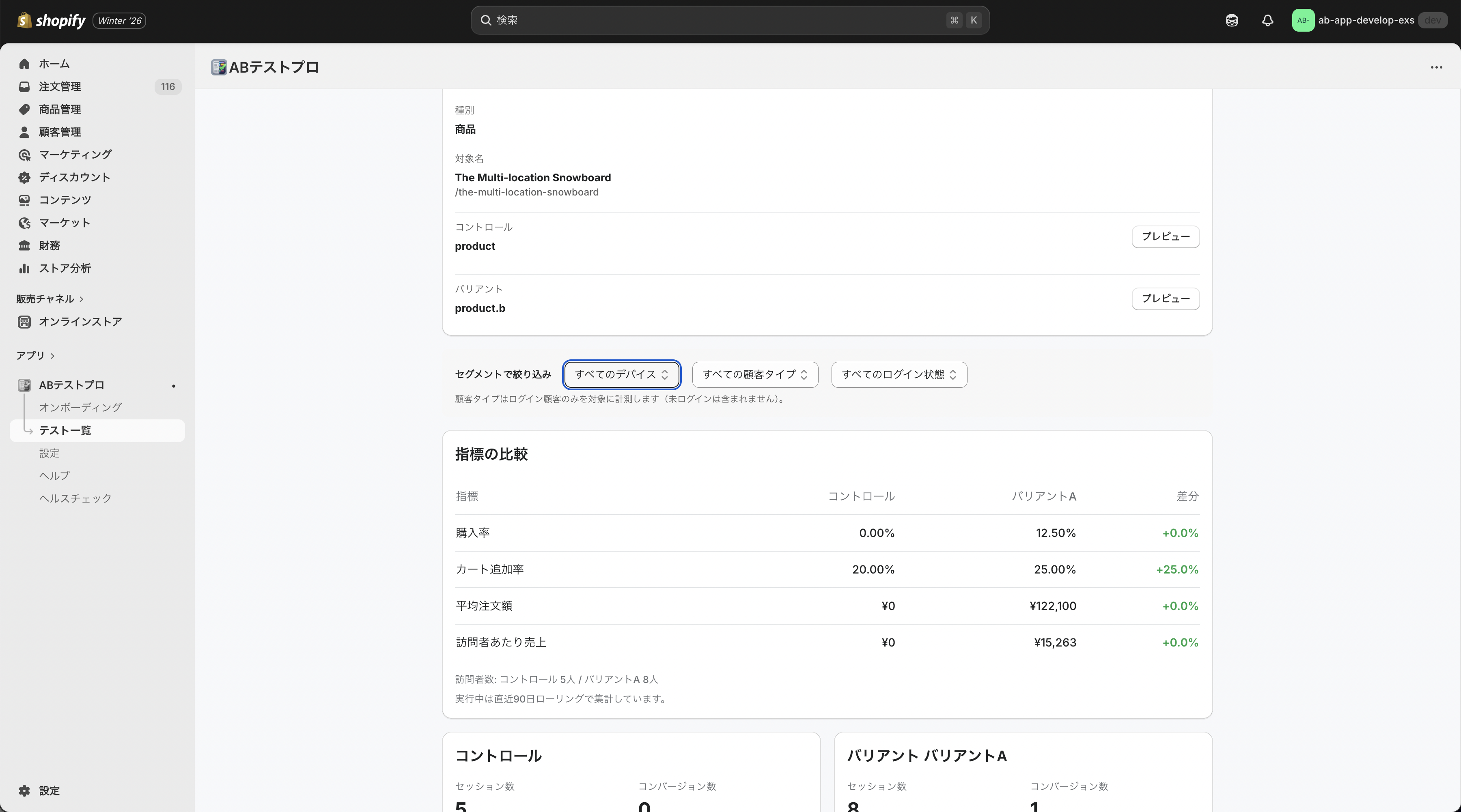 商品ページを対象にしたテストでは、購入・カート追加イベントに含まれる商品ID/ハンドルが ターゲット商品と一致する場合のみ計測されます。商品情報がイベントに含まれない場合は計測対象外になります。
