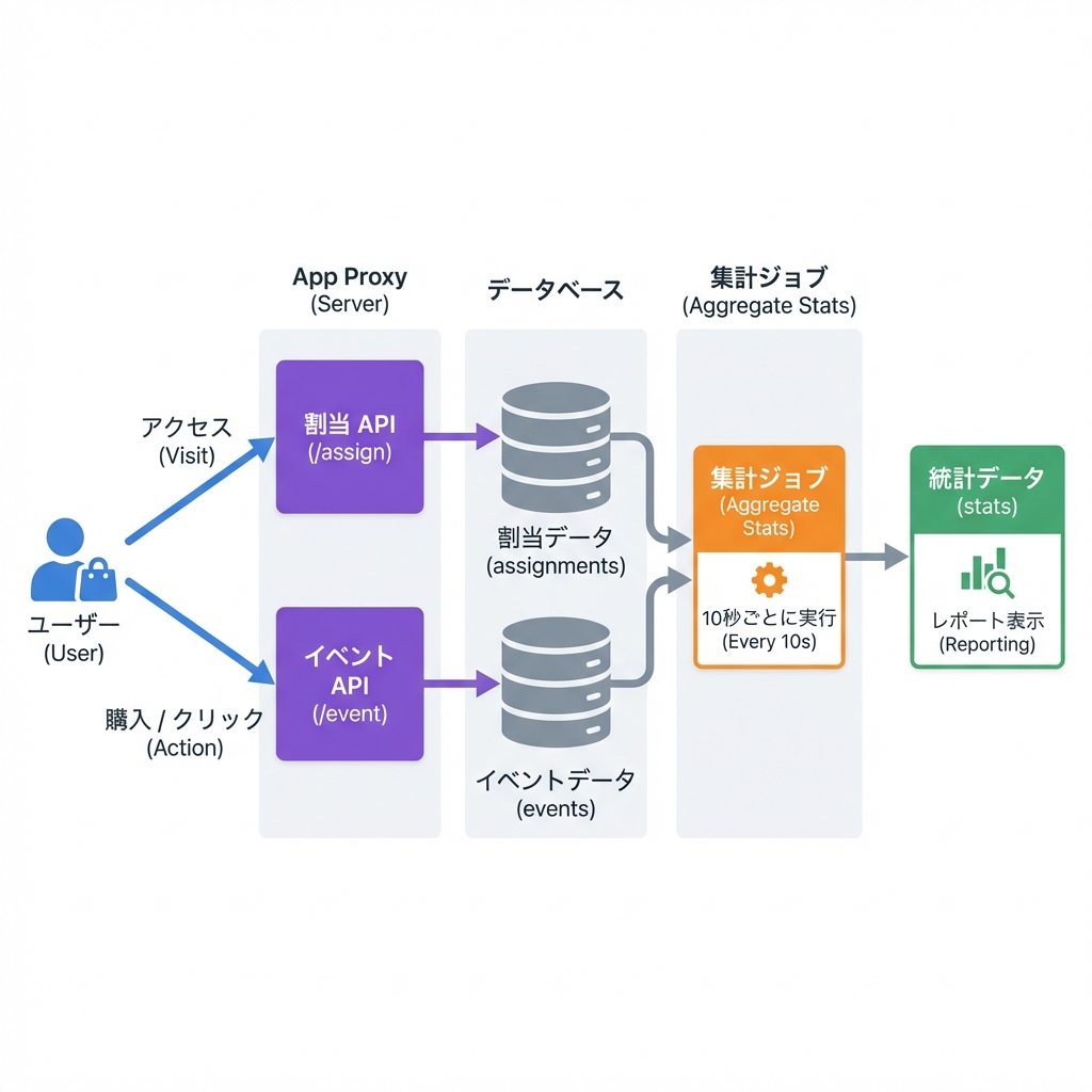 割当 → イベント送信 → 集計の流れを示す図を配置してください。