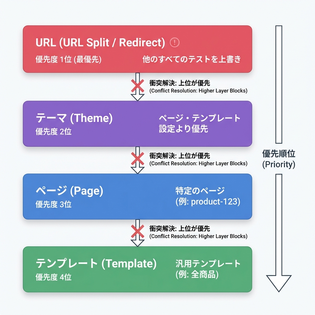 ABテストの結果がどのように計測されるか、複数テストが同時に走った場合の優先・コンフリクトの考え方をまとめます。
