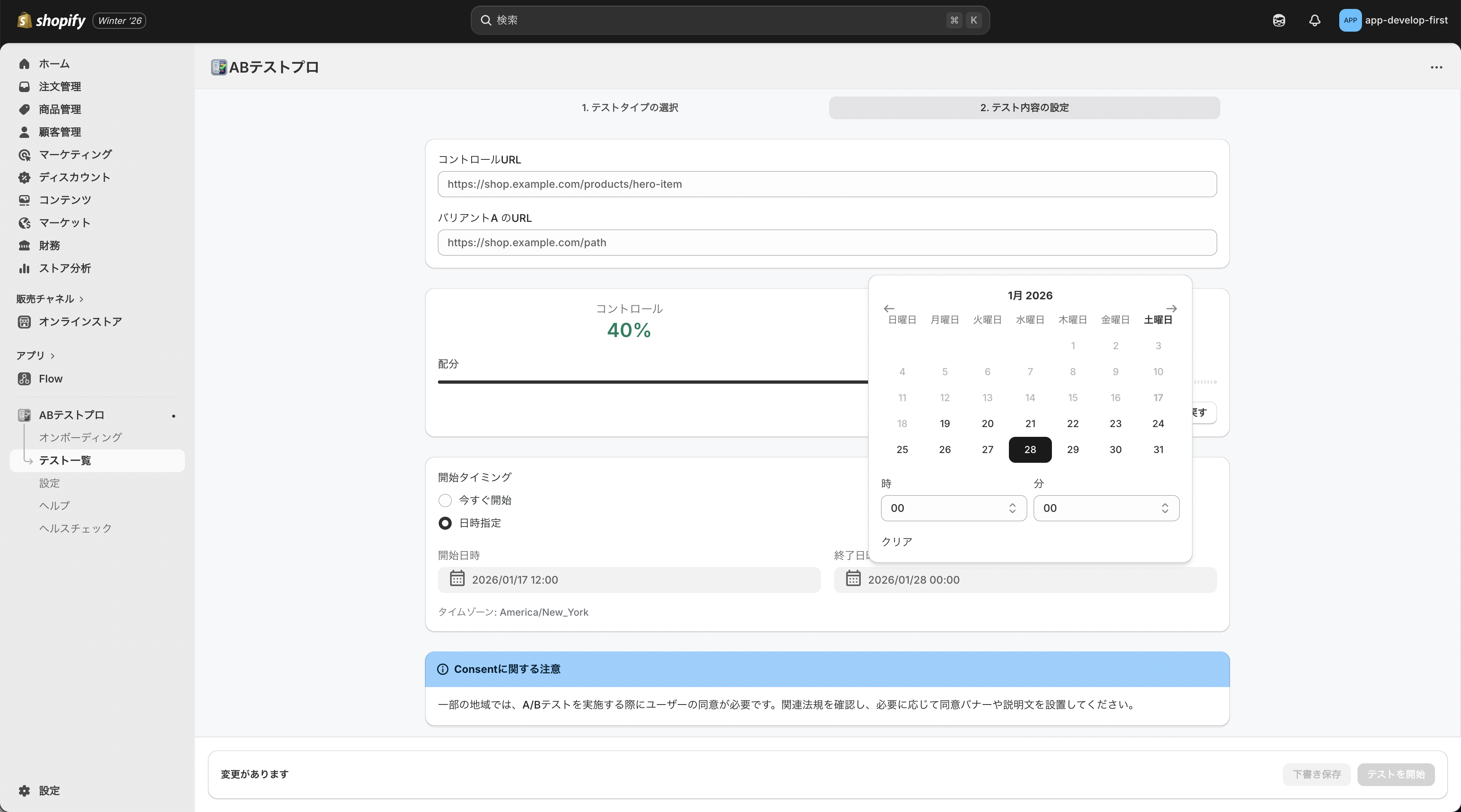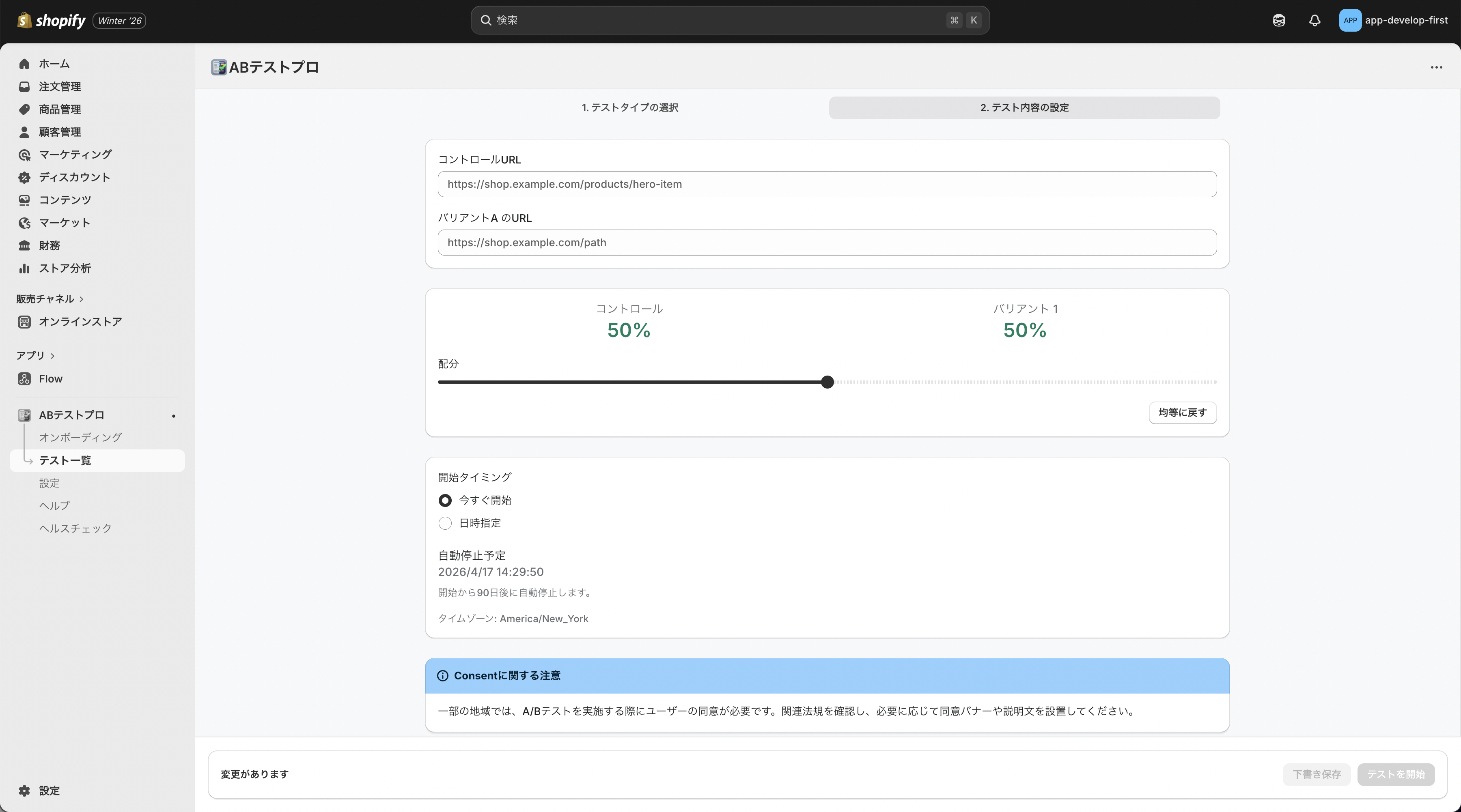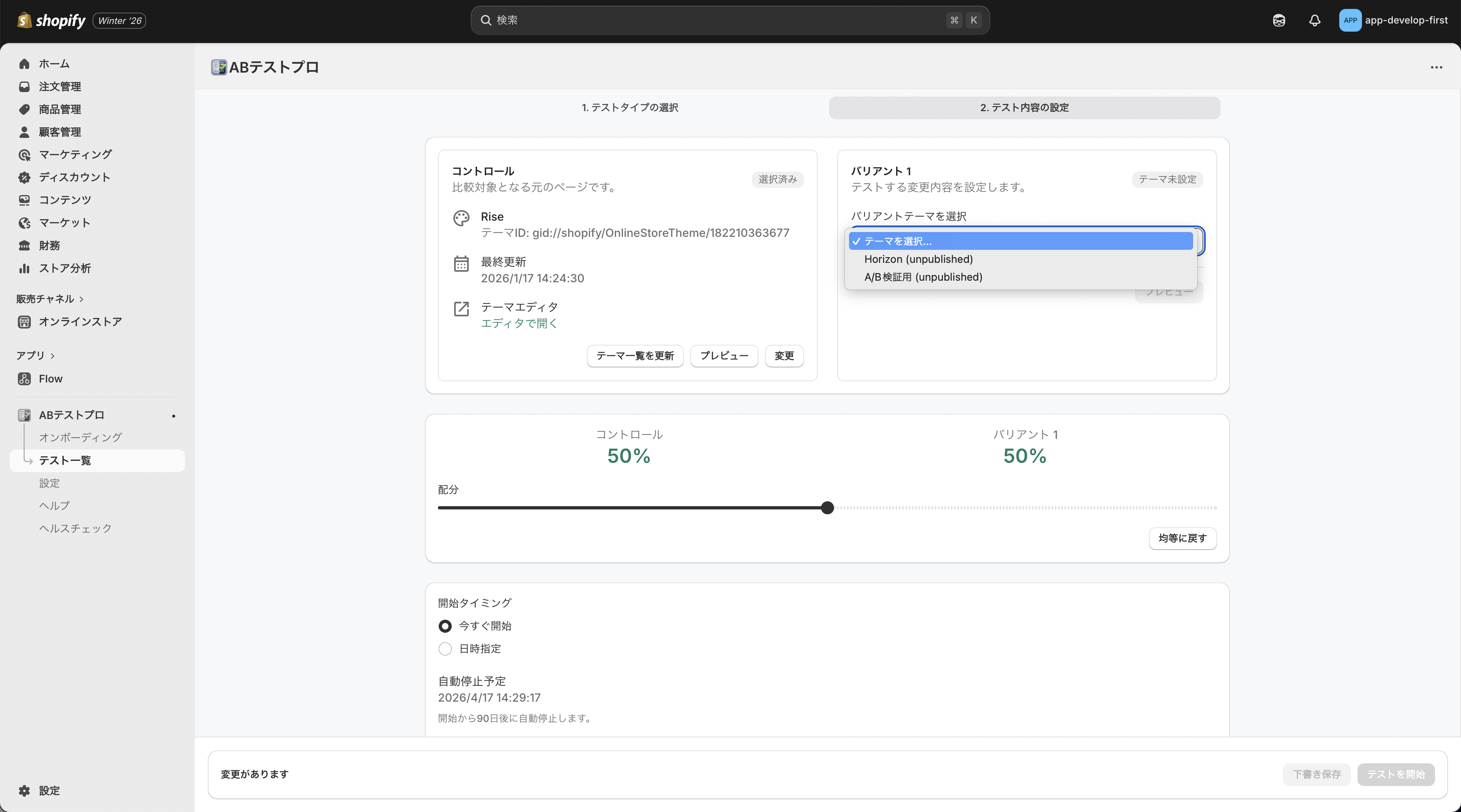 管理画面でテストを作成し、開始するまでの流れをまとめます。テストはコントロール + バリアント1の2パターンで運用します。