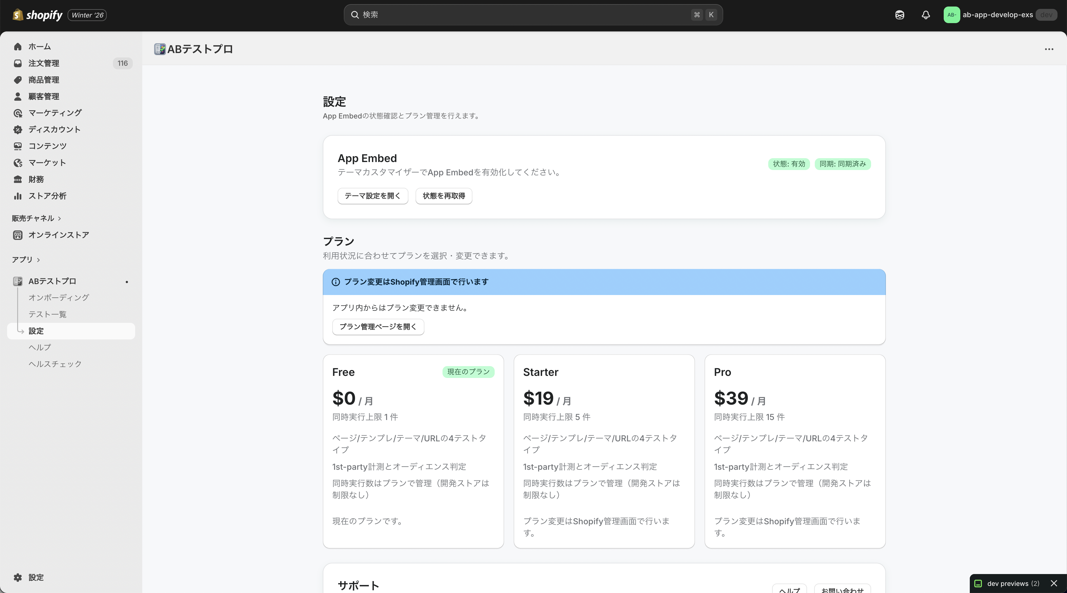 「設定」→「プラン」からプランを選択できます。開発ストアは制限が無効になります。