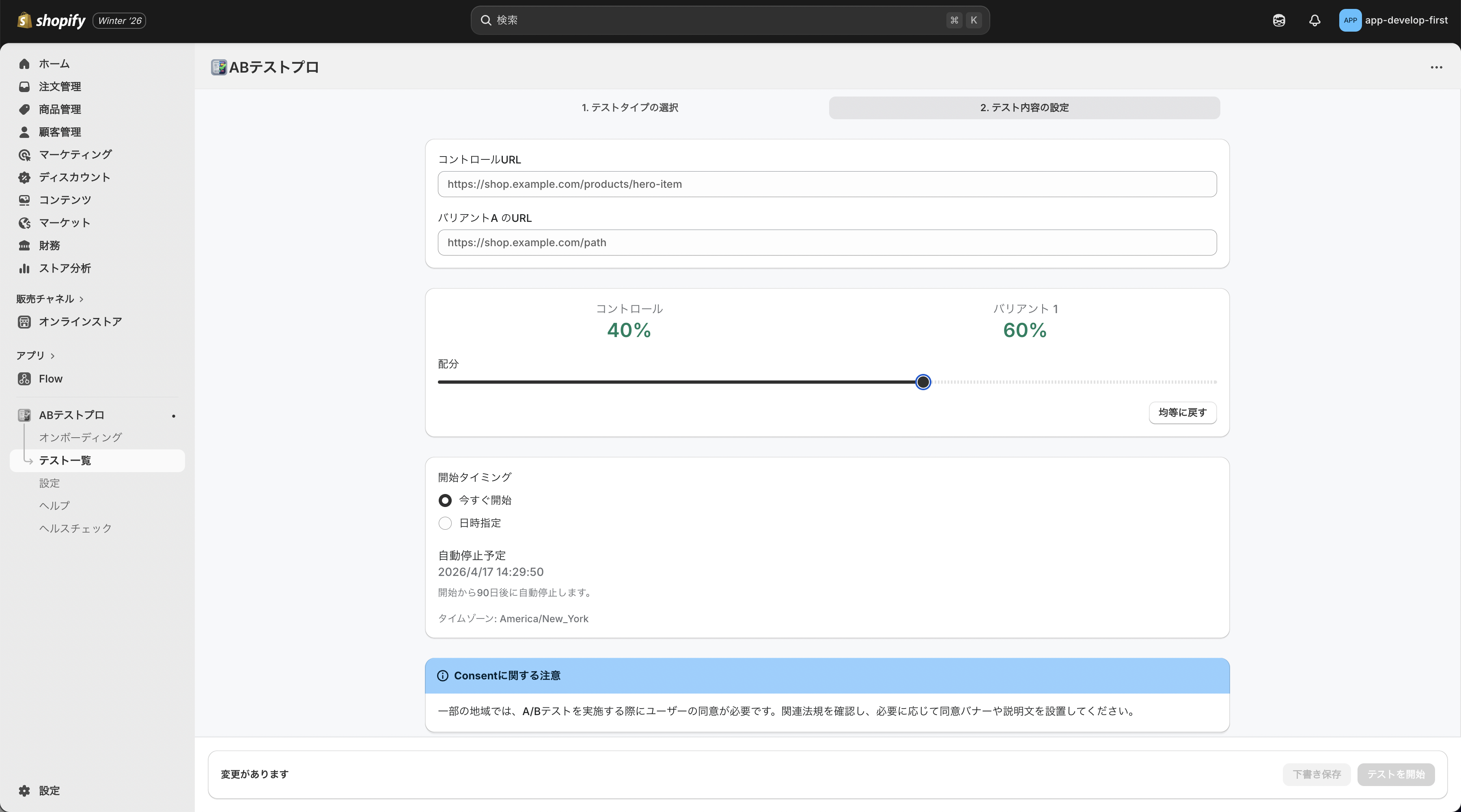 例: https://{shop}.myshopify.com/apps/ab/split/{experimentKey}